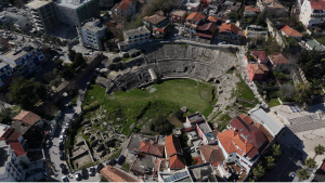 The Amphitheater in Durrës was built by the Romans more than 2,000 years ago — one of over 200 amphitheaters constructed throughout their vast empire. When famed historian Marin Barleti (Mah-reen Bahr-leh-tee) saw it in the fifteenth century, he declared: